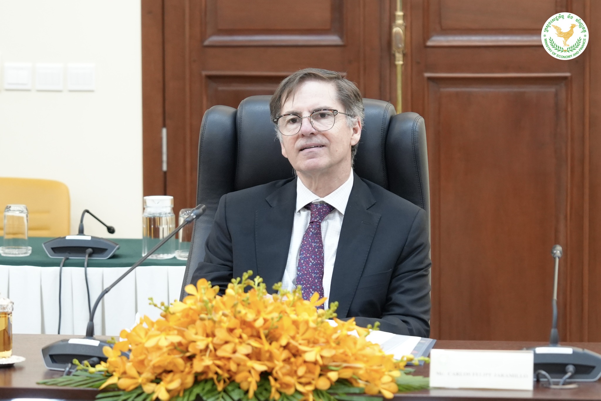 ជំនួបសវនាការរវាង ឯកឧត្តមអគ្គបណ្ឌិតសភាចារ្យ អូន ព័ន្ធមុនីរ័ត្ន ឧបនាយករដ្ឋមន្រ្តី រដ្ឋមន្រ្តីក្រសួងសេដ្ឋកិច្ច និងហិរញ្ញវត្ថុ និងឯកឧត្តម Carlos Felipe Jaramillo អនុប្រធានធនាគារពិភពលោកទទួលបន្ទុកតំបន់អាស៊ីខាងកើត និងប៉ាស៊ីហ្វិក