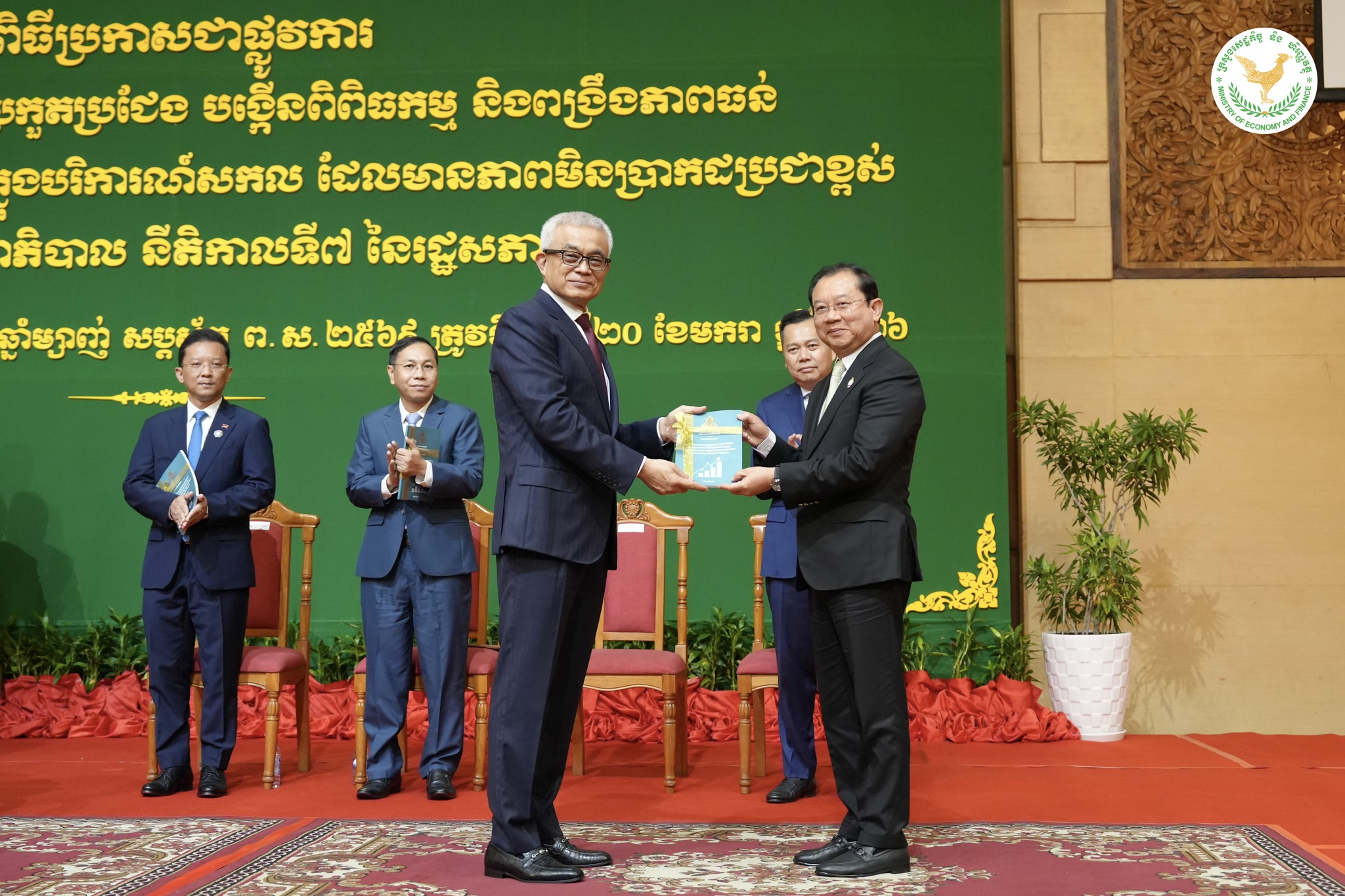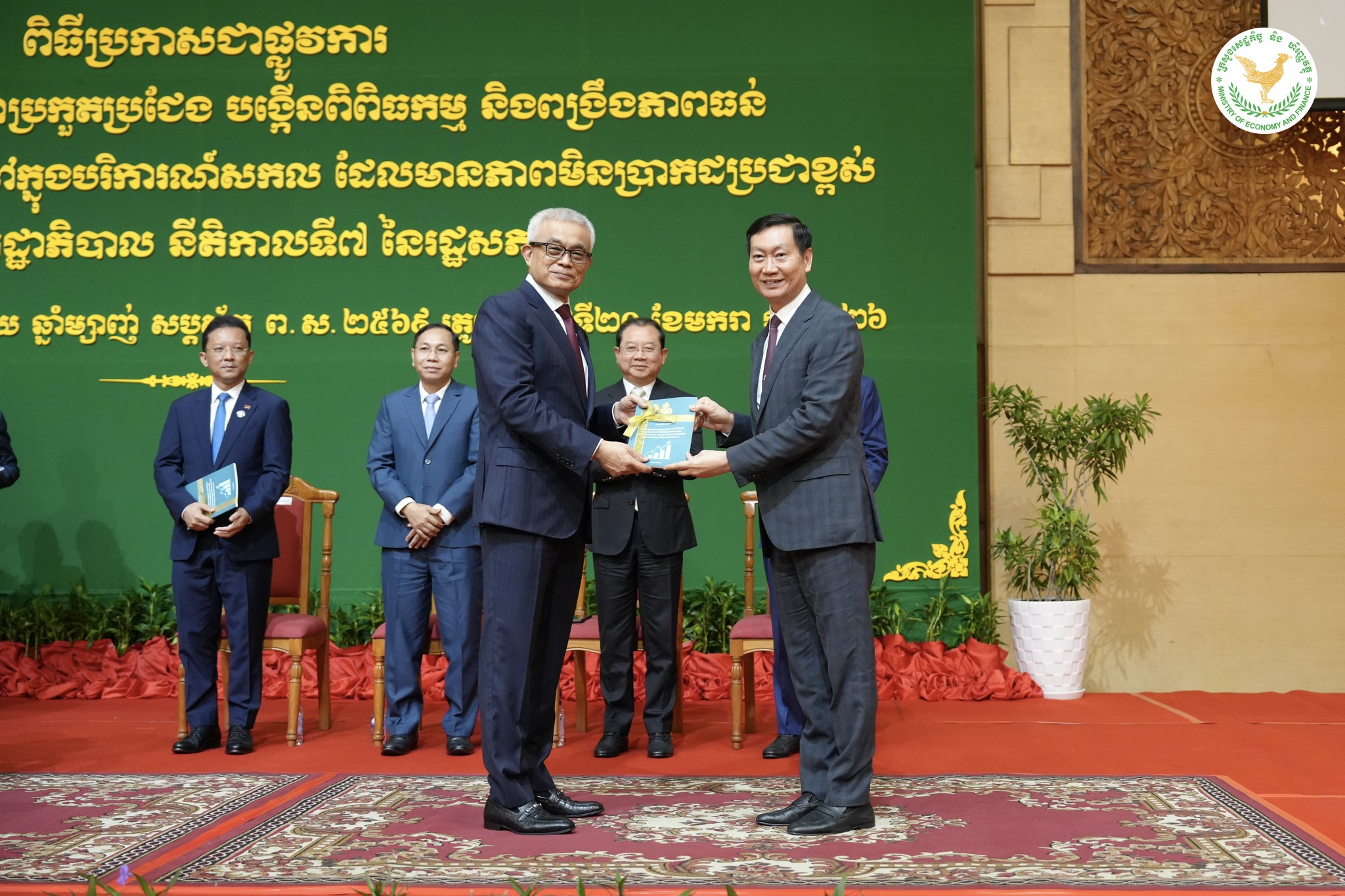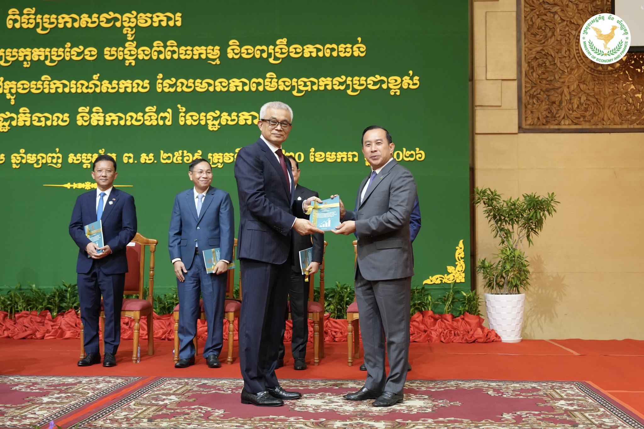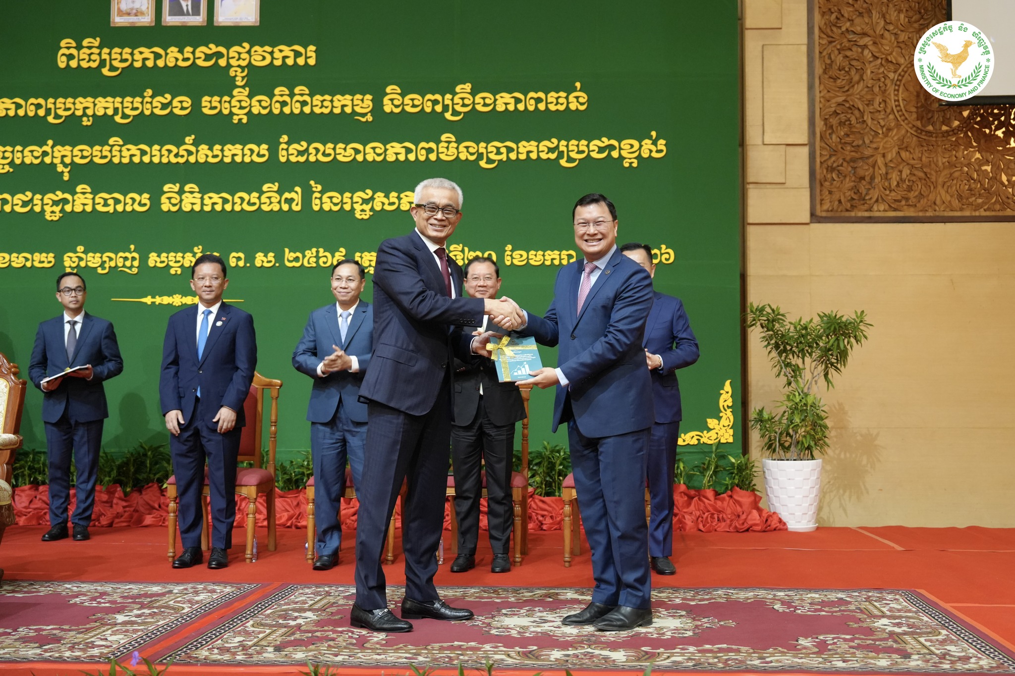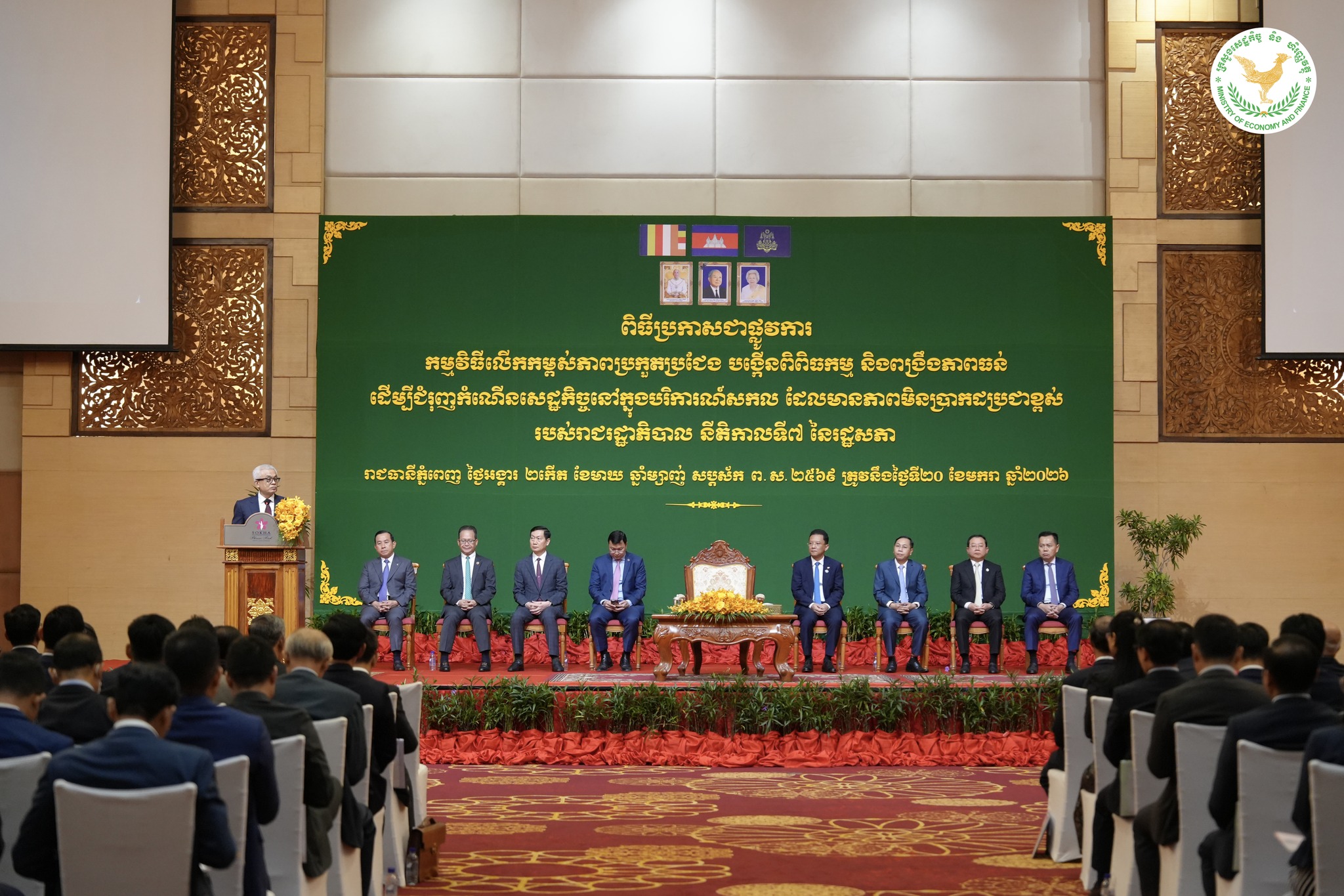 ឯកឧត្តមអគ្គបណ្ឌិតសភាចារ្យ អូន ព័ន្ធមុនីរ័ត្ន ឧបនាយករដ្ឋមន្ត្រី រដ្ឋមន្ត្រីក្រសួងសេដ្ឋកិច្ច និងហិរញ្ញវត្ថុ និងជាប្រធានគណៈកម្មាធិការគោលនយោបាយ និងហិរញ្ញវត្ថុ បានអញ្ជើញជាអធិបតីដ៏ខ្ពង់ខ្ពស់ ក្នុងពិធីប្រកាសដាក់ឱ្យអនុវត្តជាផ្លូវការ នូវ «កម្មវិធីលើកកម្ពស់ ភាពប្រកួតប្រជែង បង្កើនពិពិធកម្ម និង ពង្រឹងភាពធន់ ដើម្បីជំរុញកំណើនសេដ្ឋកិច្ច ក្នុងបរិការណ៍សកល ដែលមានភាពមិនប្រាកដប្រជាខ្ពស់ របស់រាជរដ្ឋាភិបាល នីតិកាលទី ៧ នៃរដ្ឋសភា», នាព្រឹកថ្ងៃទី ២០ ខែ មករា ឆ្នាំ ២០២៦, នៅសណ្ឋាគារសុខាភ្នំពេញ ។